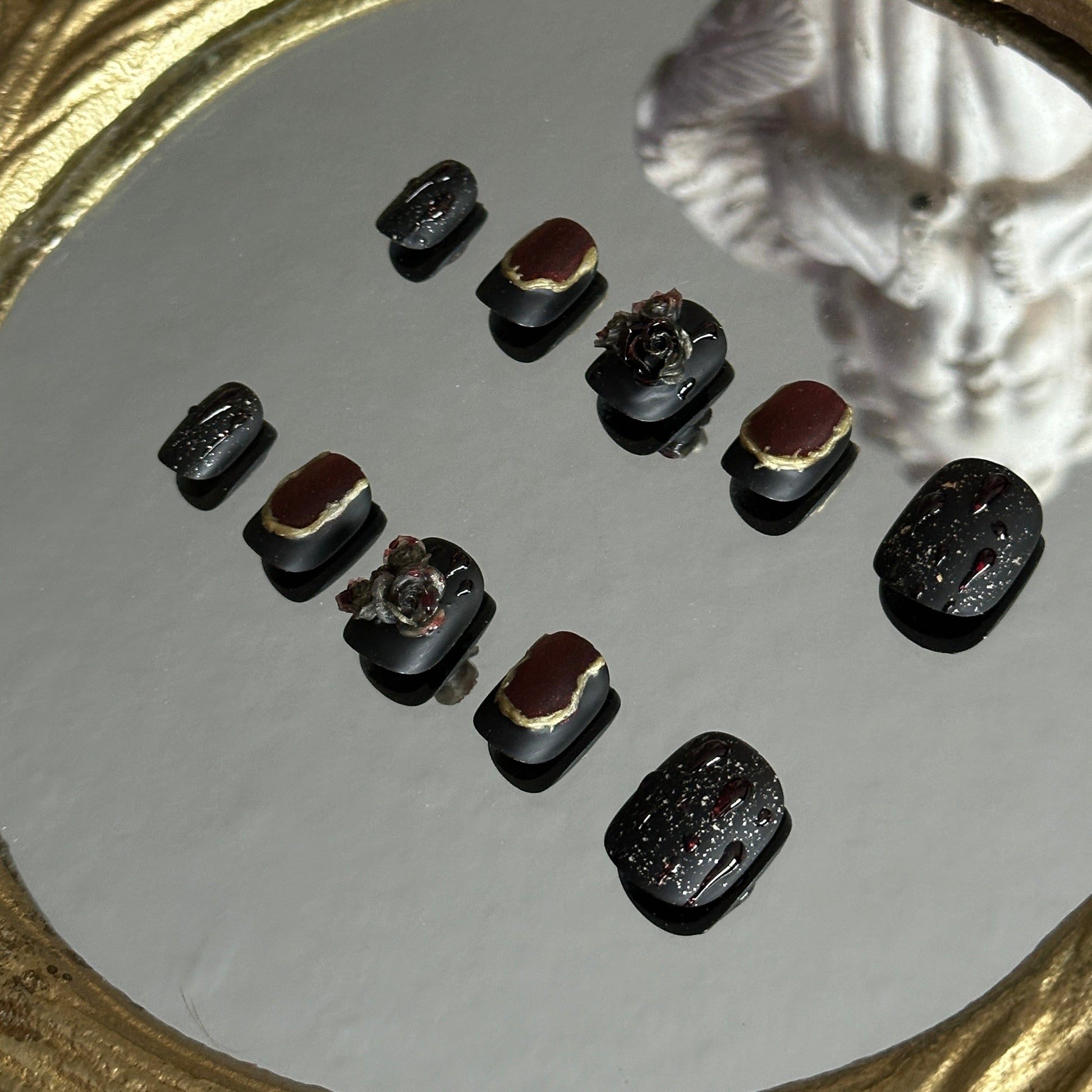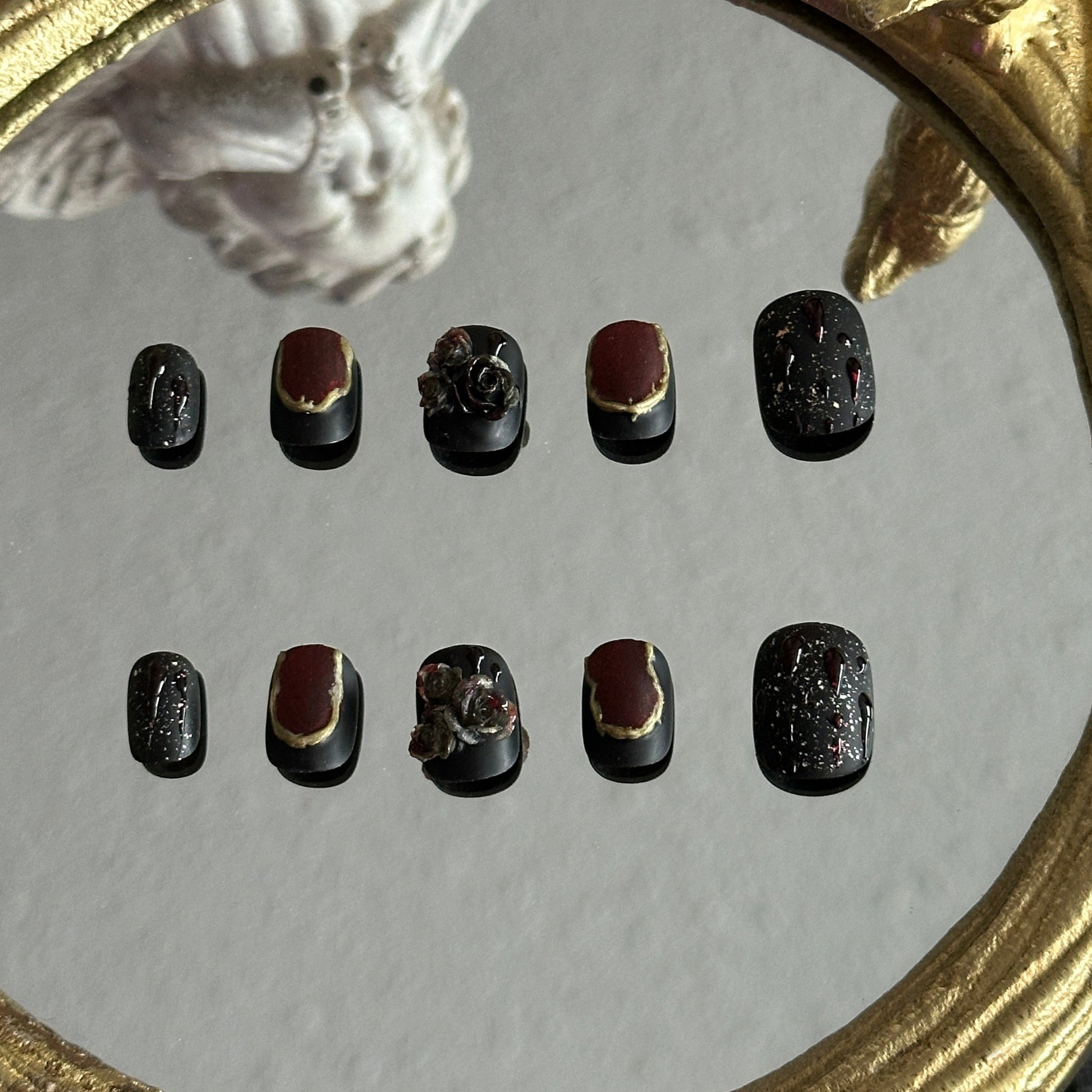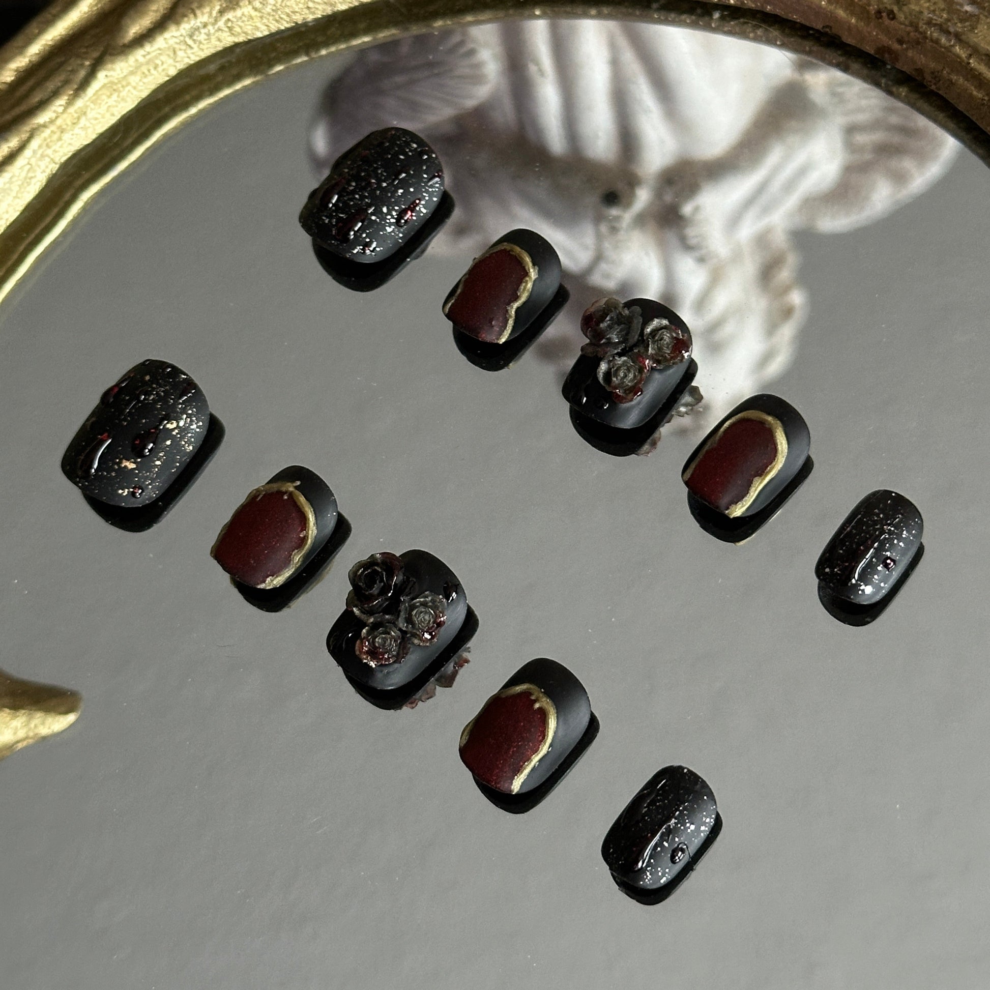 - The Magic: These nails are designed to be tactile; the 3D rose and gold textures provide a sensory experience that standard flat polish cannot replicate, making them the ultimate accessory for a gothic-themed photoshoot.