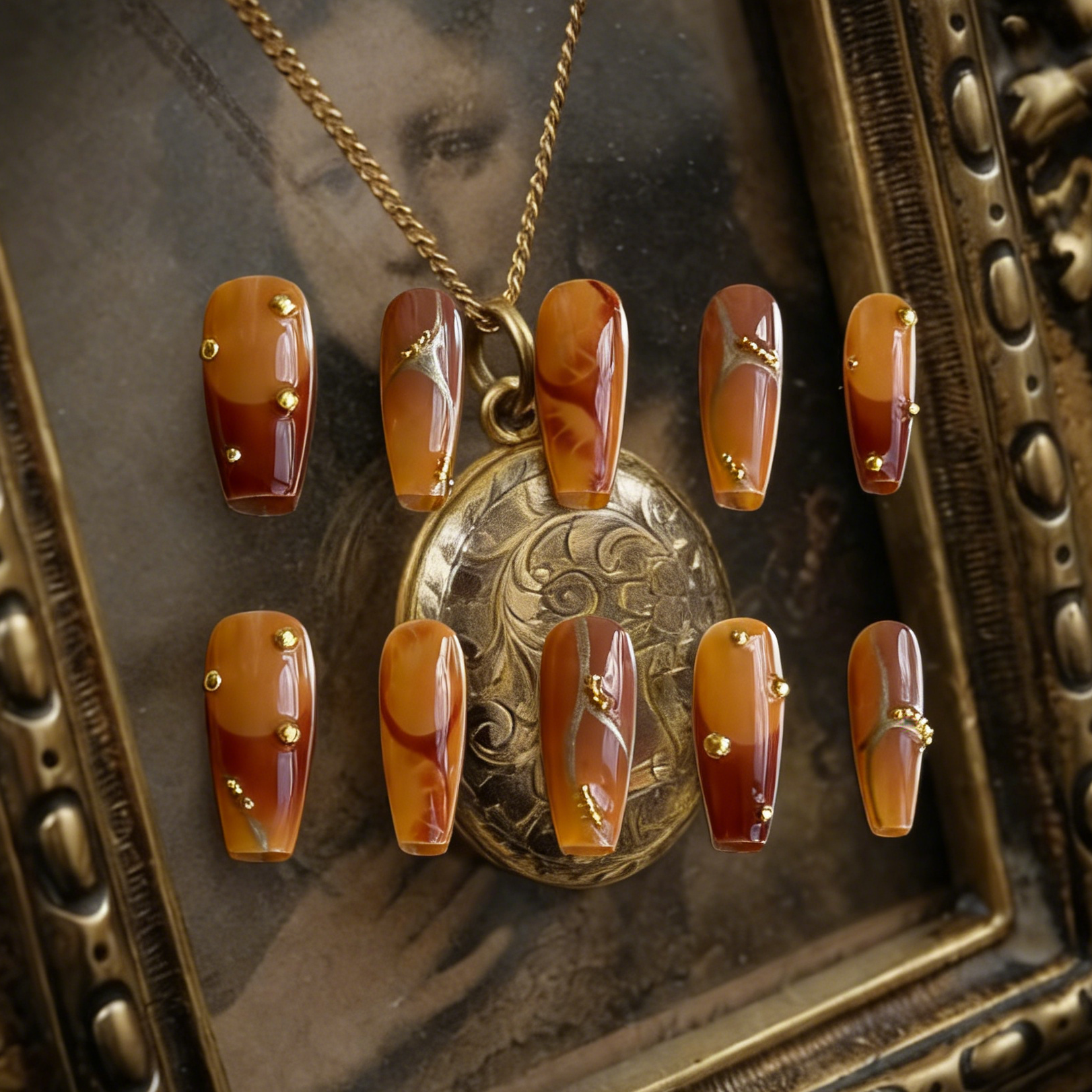 Caramel Stone is an ode to the raw, unyielding beauty of natural elements. This set features a stunning amber marble texture, where deep burnt-orange hues swirl into warm honey tones, mimicking the organic patterns of precious gemstones. To enhance this earthy elegance, MYOB Nails has hand-applied delicate gold lines accents and miniature golden studs, creating a luxurious "liquid gold" effect. It is a sophisticated, grounded collection designed for those who find power in nature and seek an "exquisite yet independent" aesthetic.