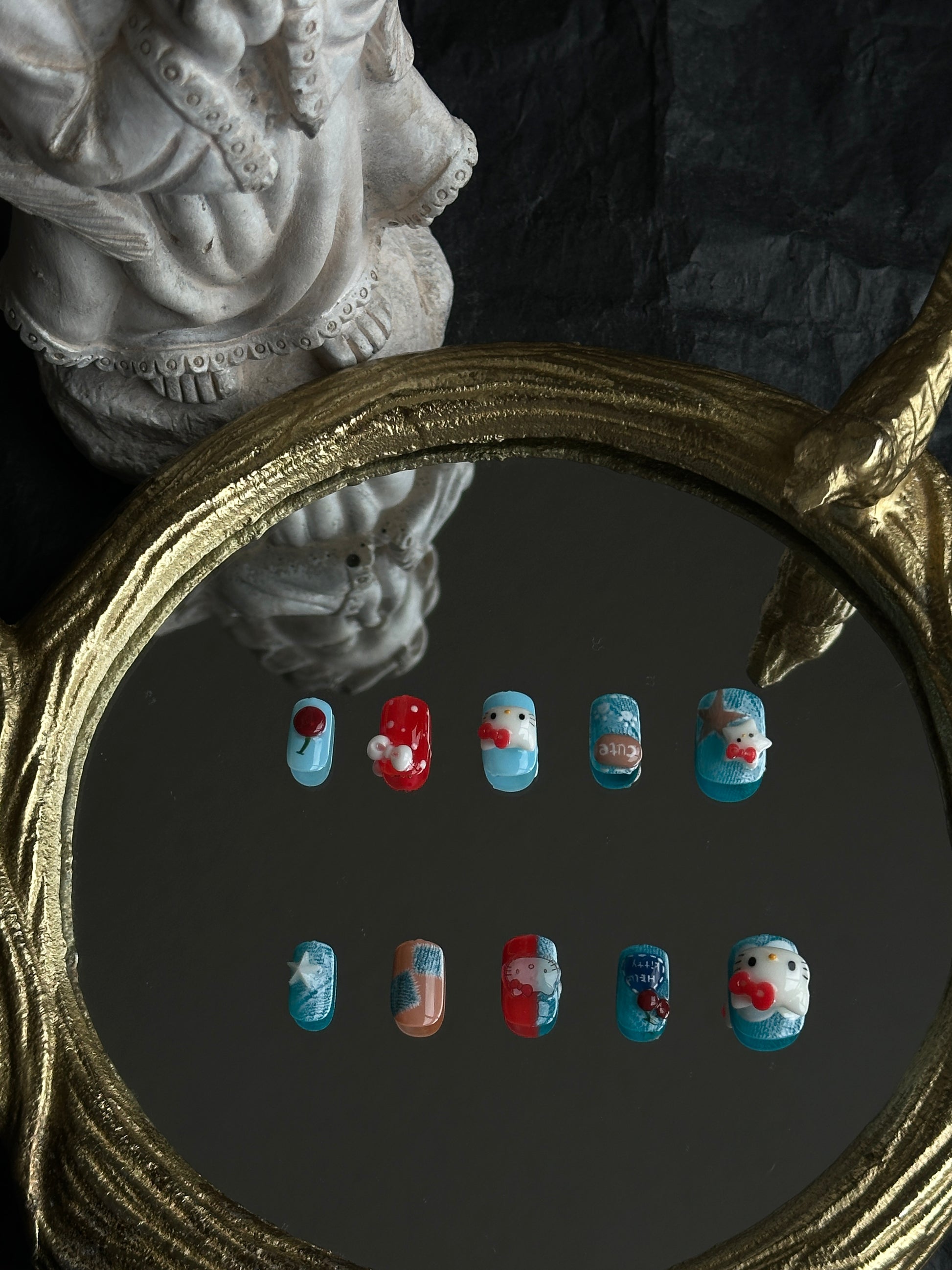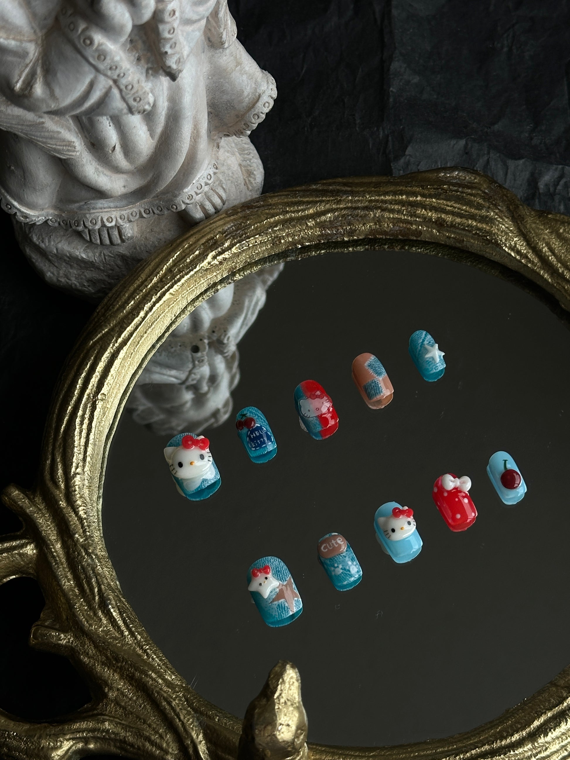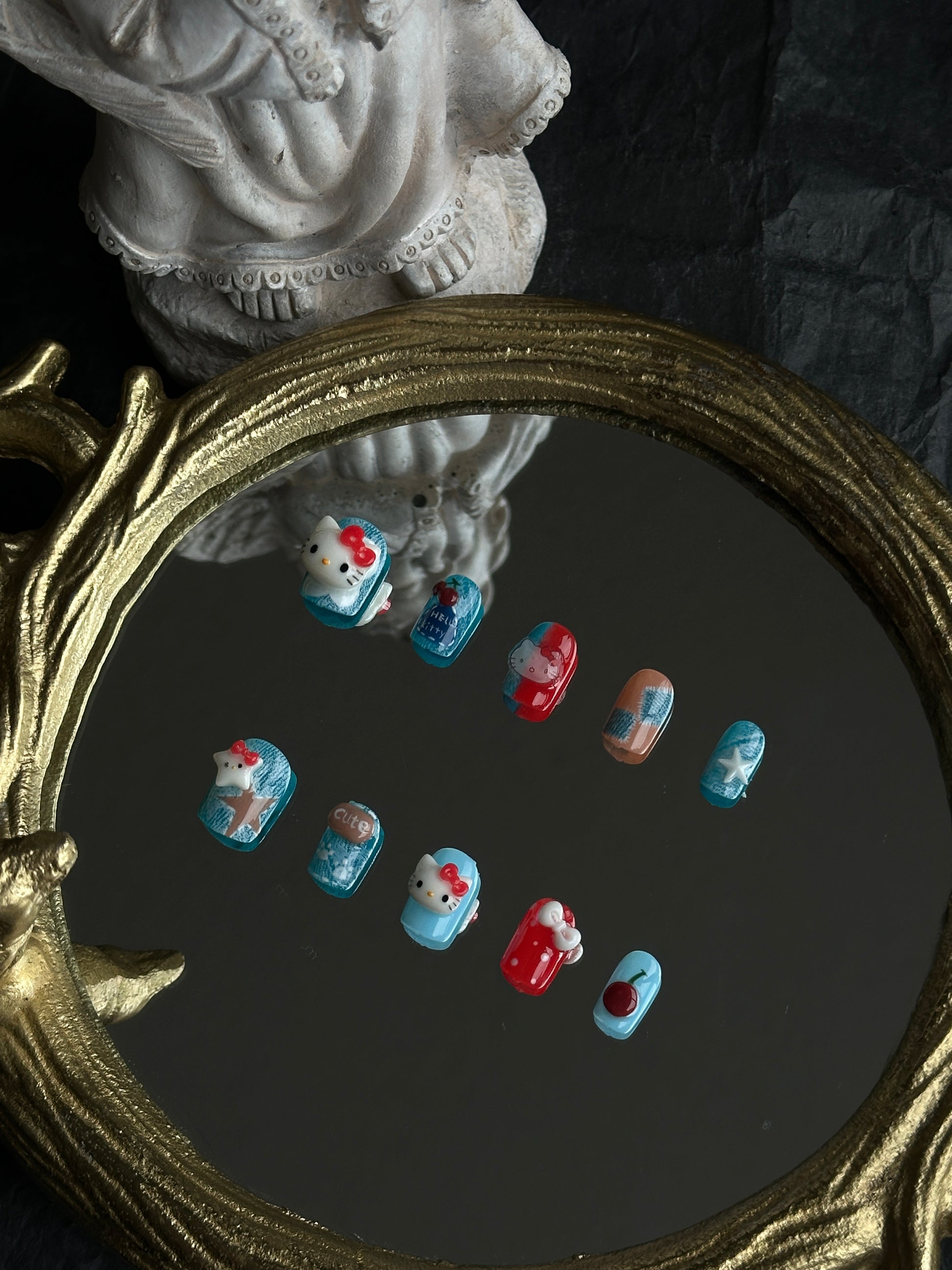 Add a playful touch with Denim Kitty press-on nails. Featuring blue denim textures, red bow kitty designs, and tiny cherries for a fun, cute look. Perfect for casual outings or gifting.