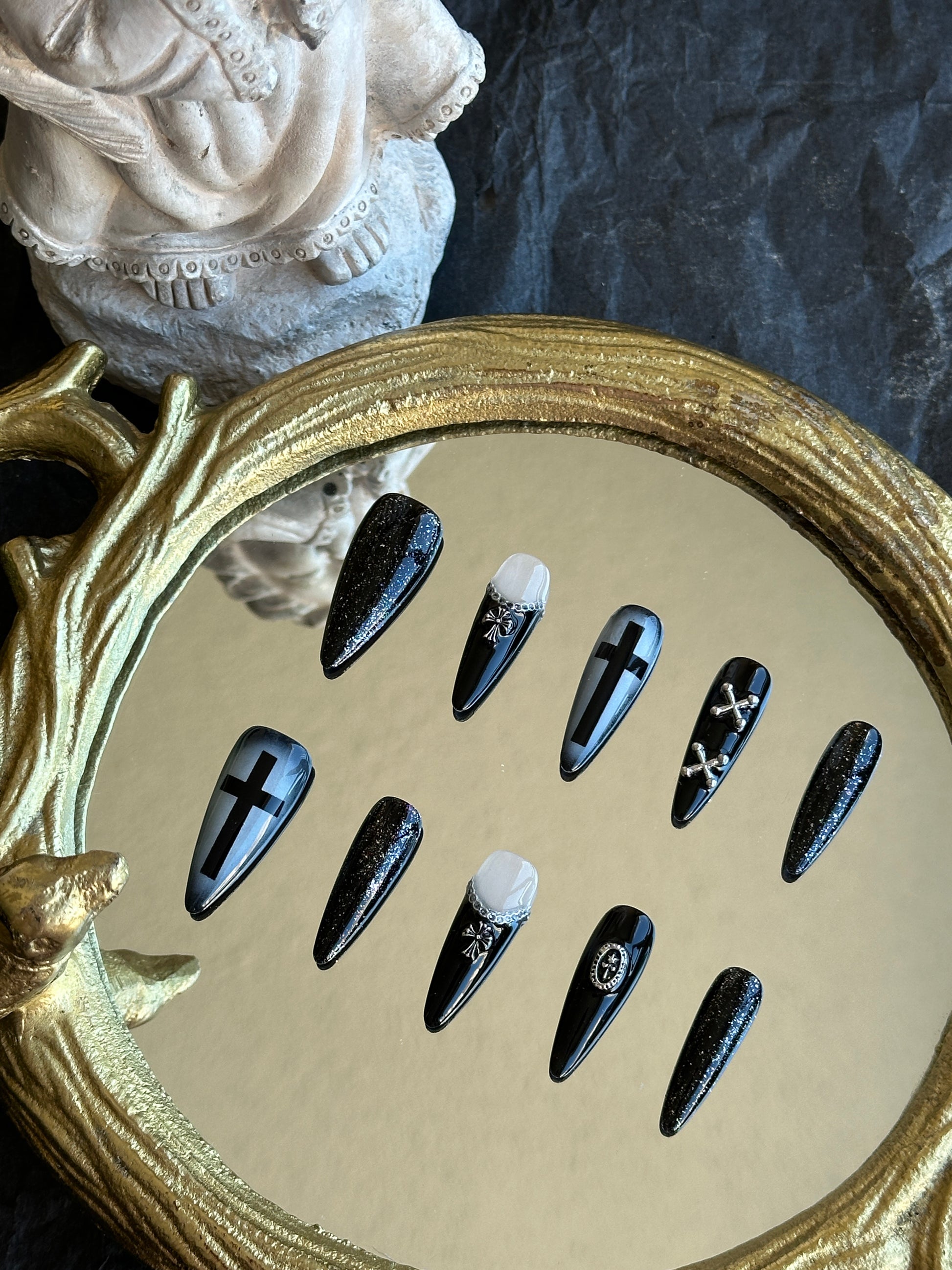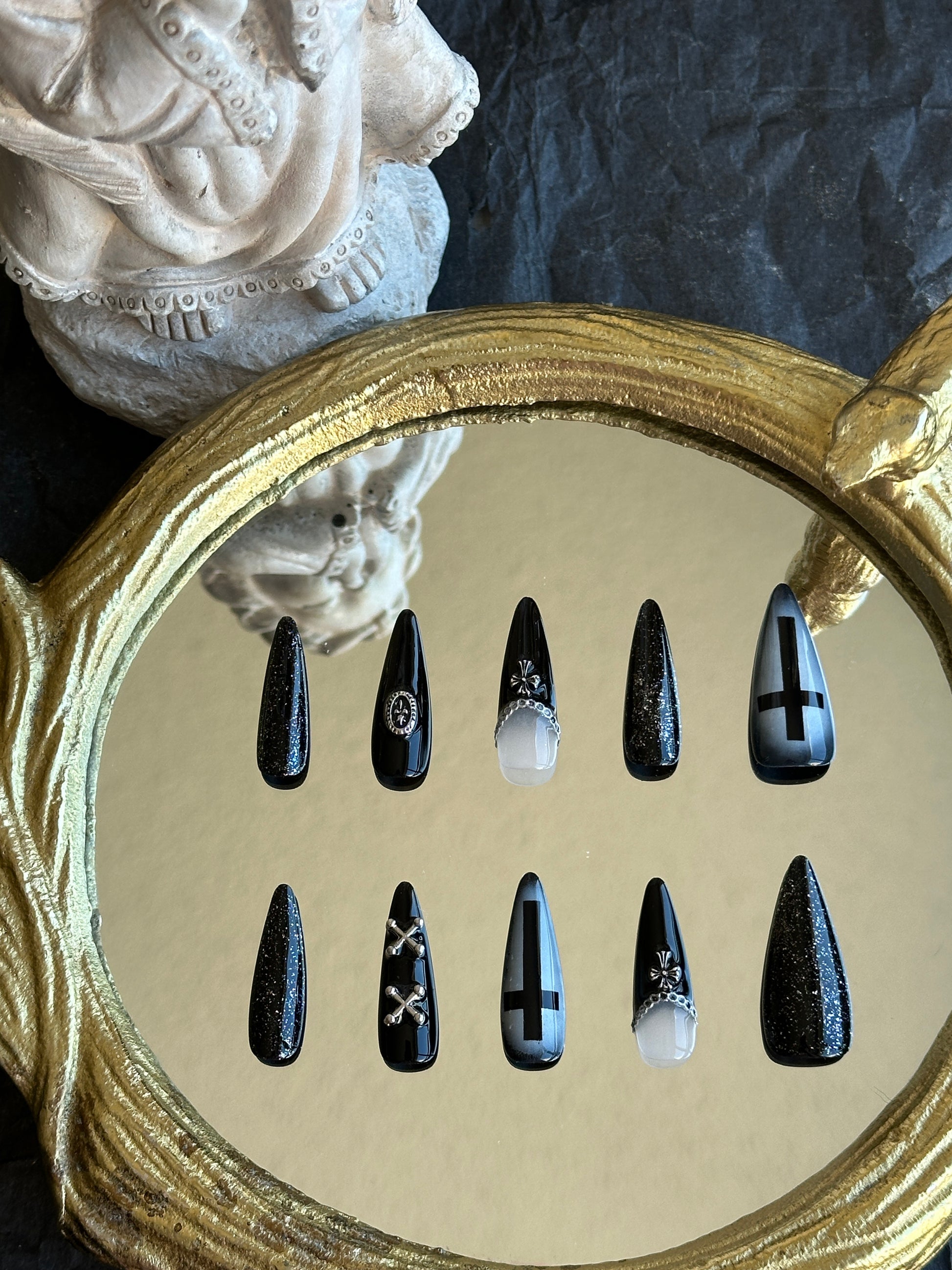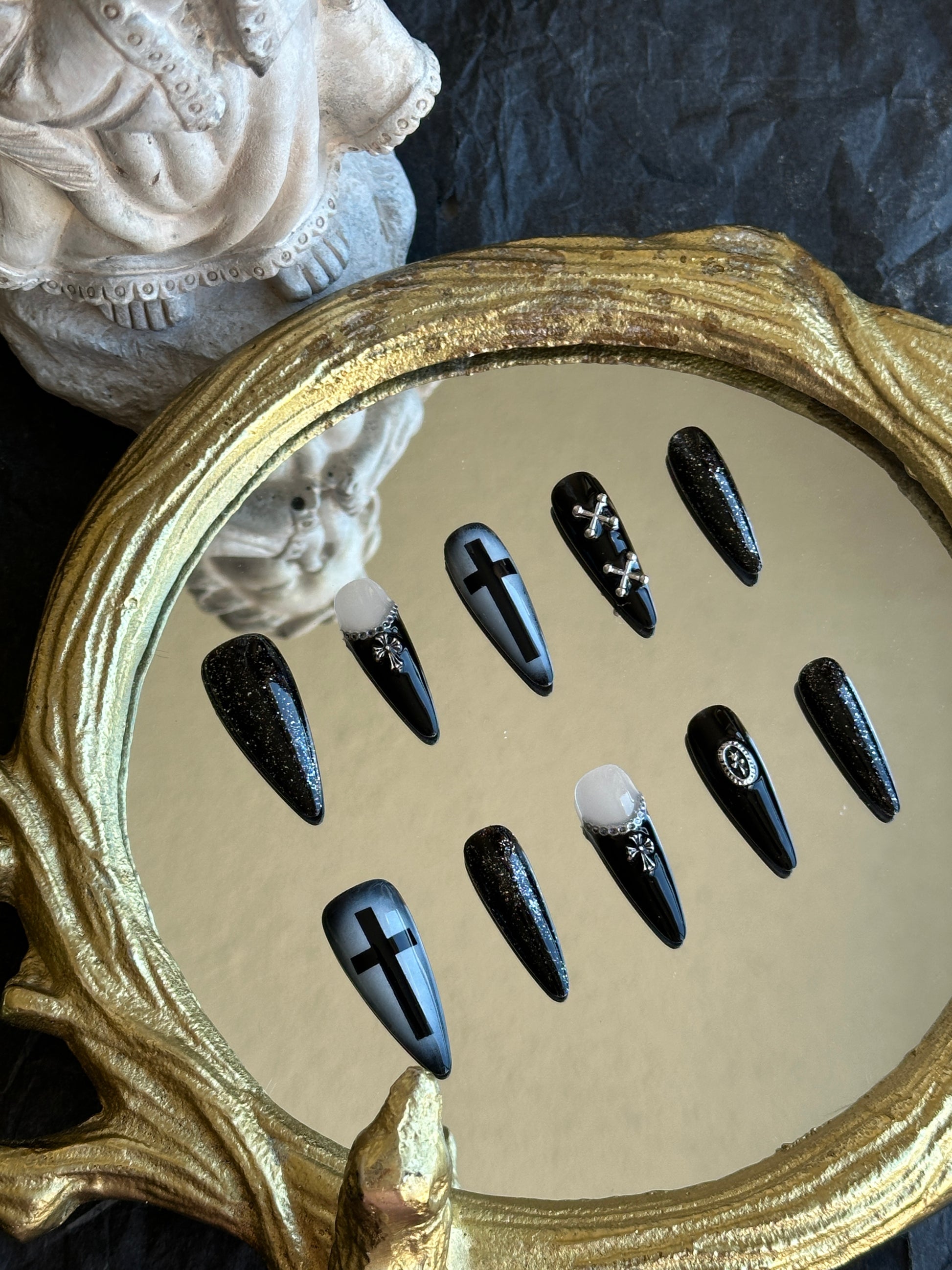 Step into the shadows with “Eclipse of Faith” press-on nails. Black bases shimmer with silver glitter, featuring hollow cross designs and French tips adorned with chains and crosses for a striking gothic statement. Perfect for dark fashion enthusiasts or dramatic looks.