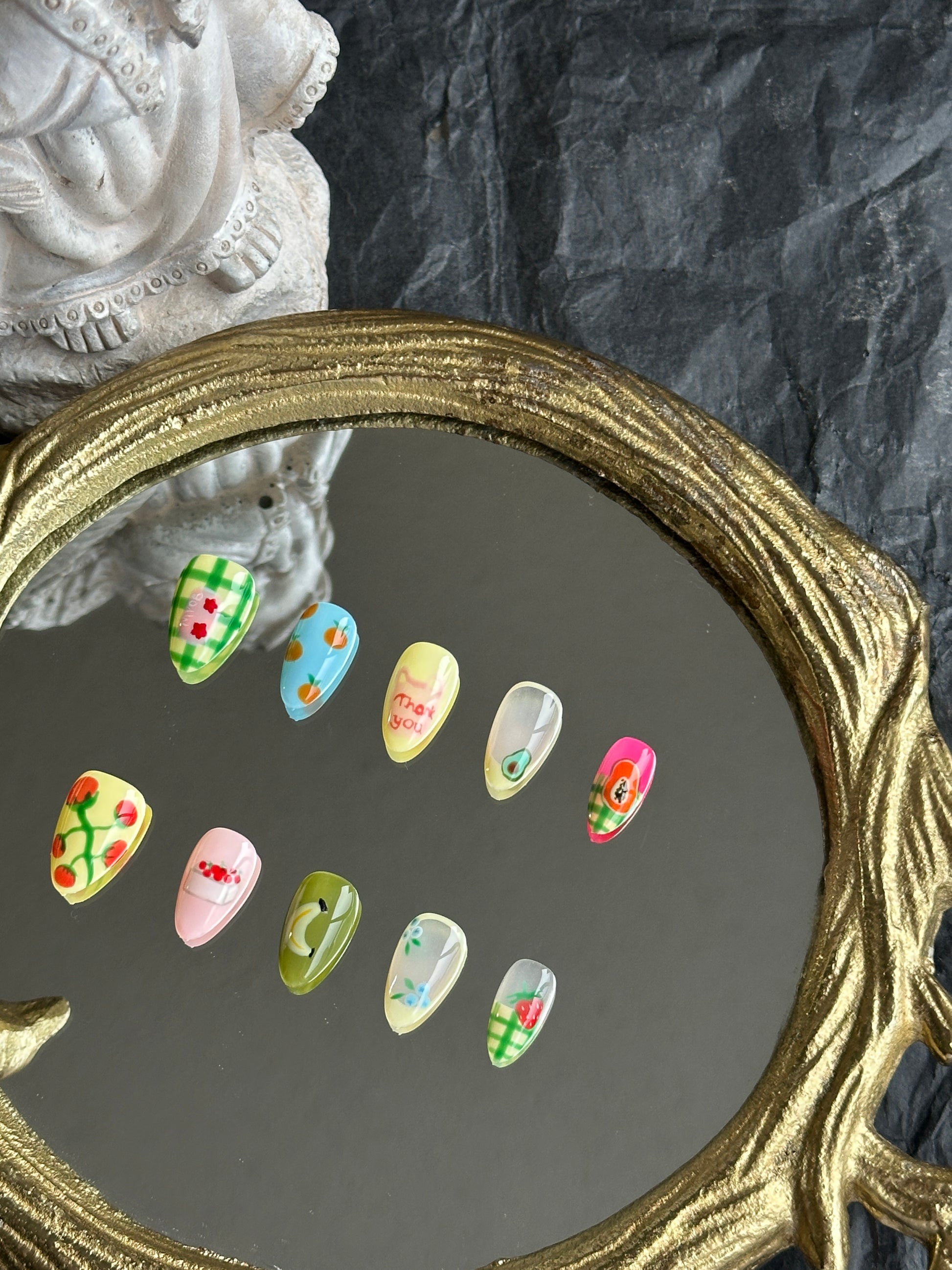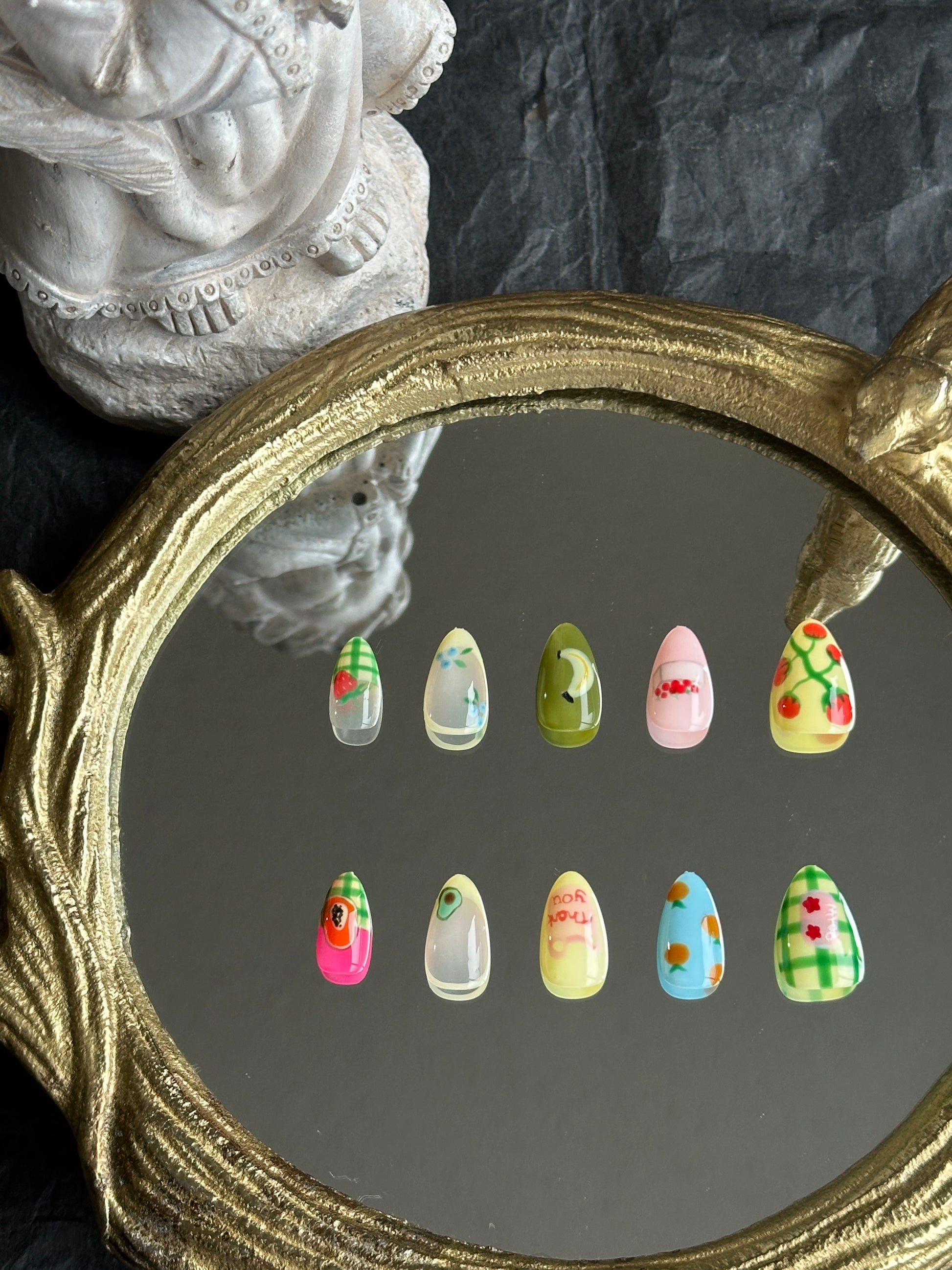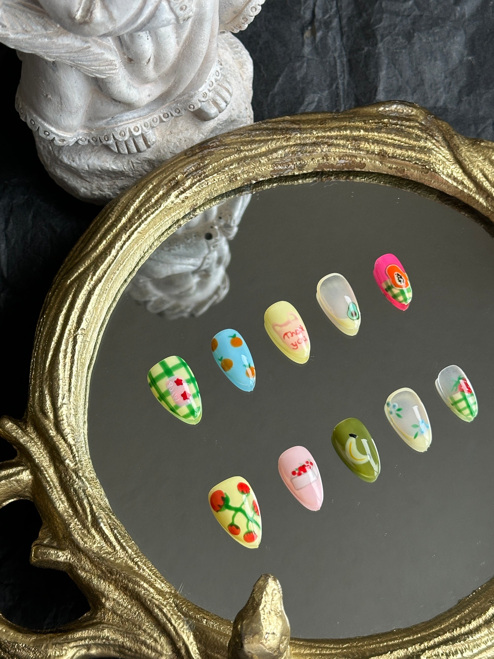 Bring a pop of color to your look with “Fruit Market” press-on nails. Cheerful, hand-painted designs with playful accents create a fun, lively style perfect for everyday wear or gifting.