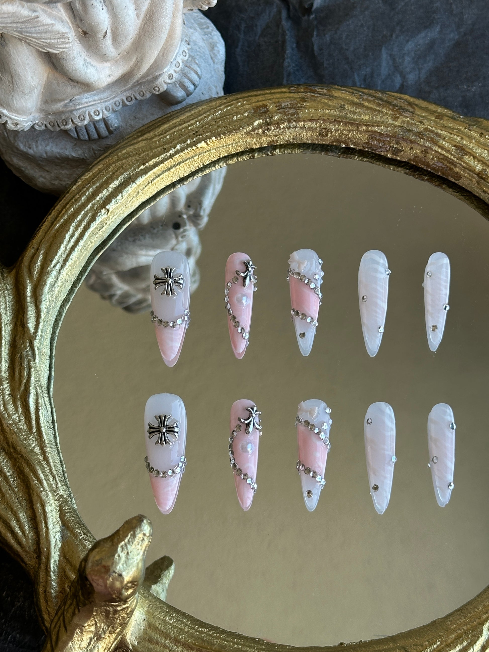 Embrace your sweet yet daring side with Princess Rebel press-on nails. Featuring sheer pink bases and soft pink French tips lined with sparkling crystals, each nail tells a story: a Clou de Coeur accent on the thumb, ribbon-shaped crystal trails with a central pearl on the index, a pink color block adorned with crystals and a tiny bow on the middle finger, and white zebra stripes with crystal accents on the ring and pinky. Perfect for girls who love a cute, luxurious, and slightly edgy princess vibe!