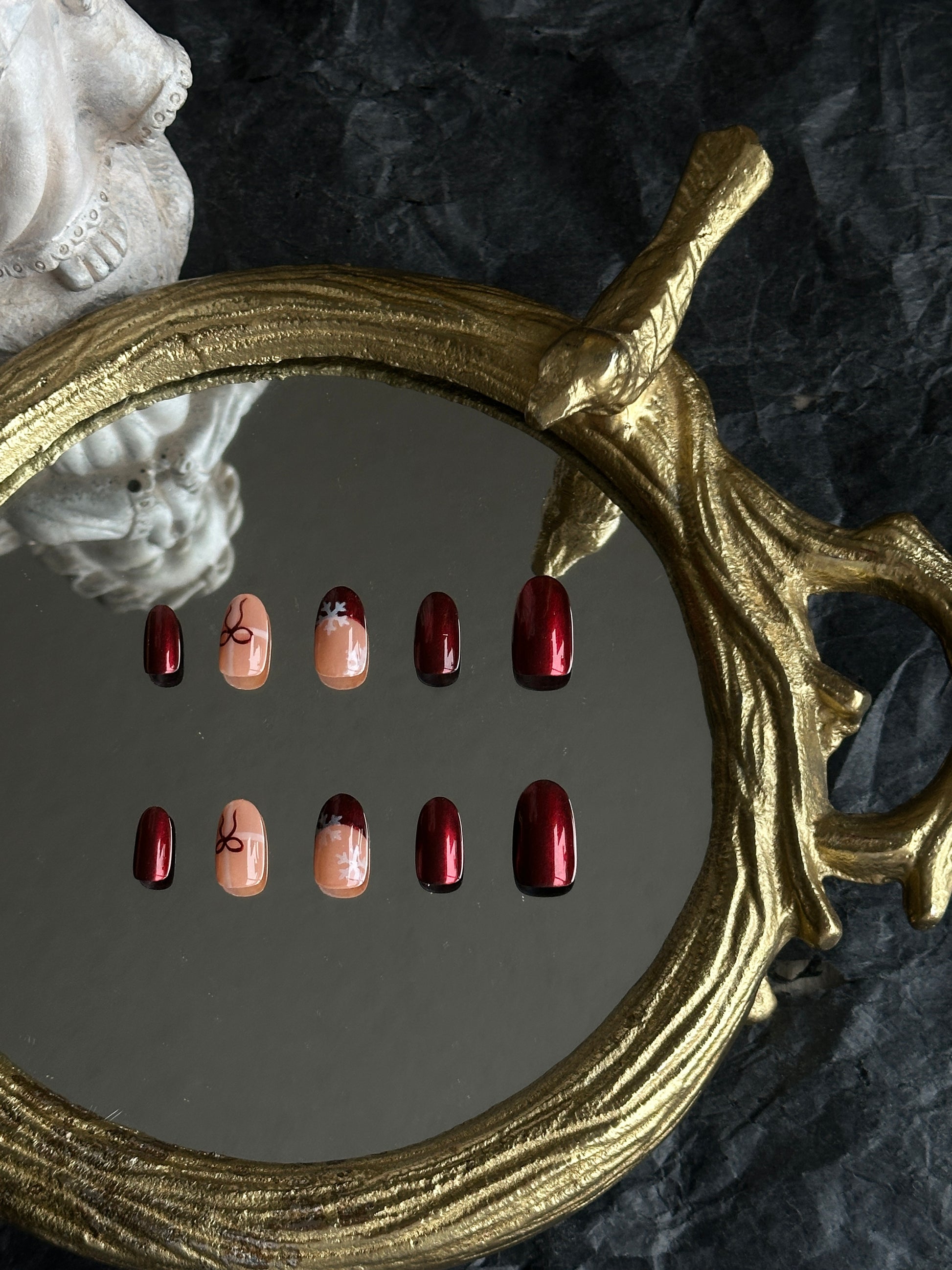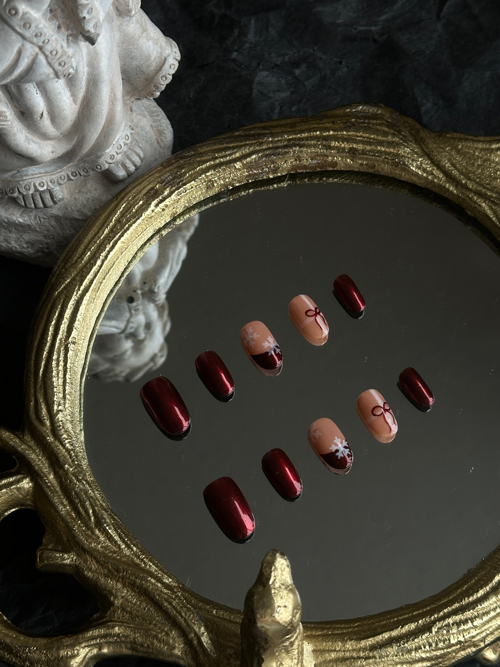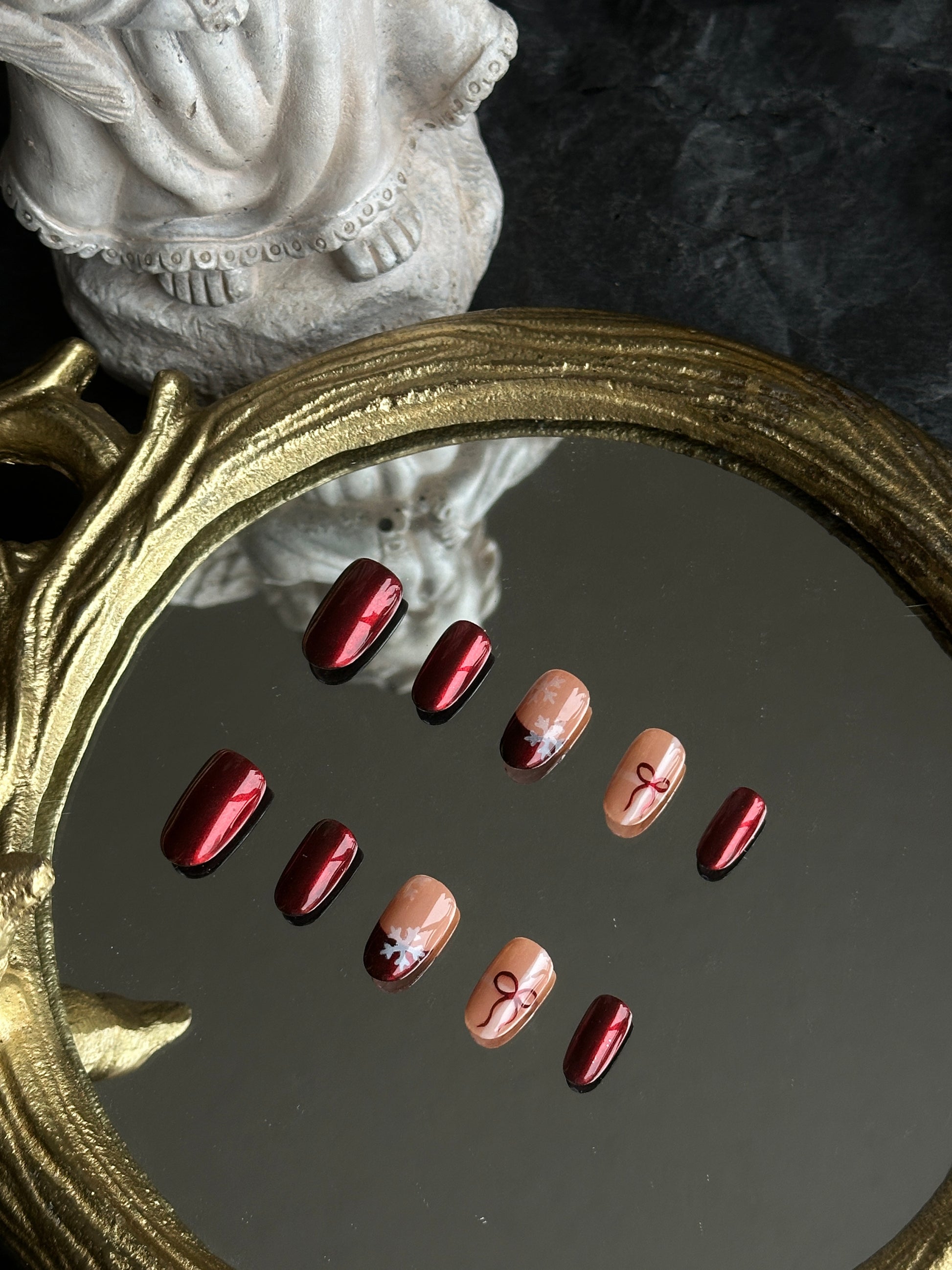 Let your nails sparkle like holiday magic with Ruby Snow — a timeless Christmas set that blends deep ruby red chrome with soft nude tones. Each nail features delicate snowflake and ribbon details, capturing the cozy charm and elegance of winter celebrations. A perfect mix of warmth and shine for your holiday look.