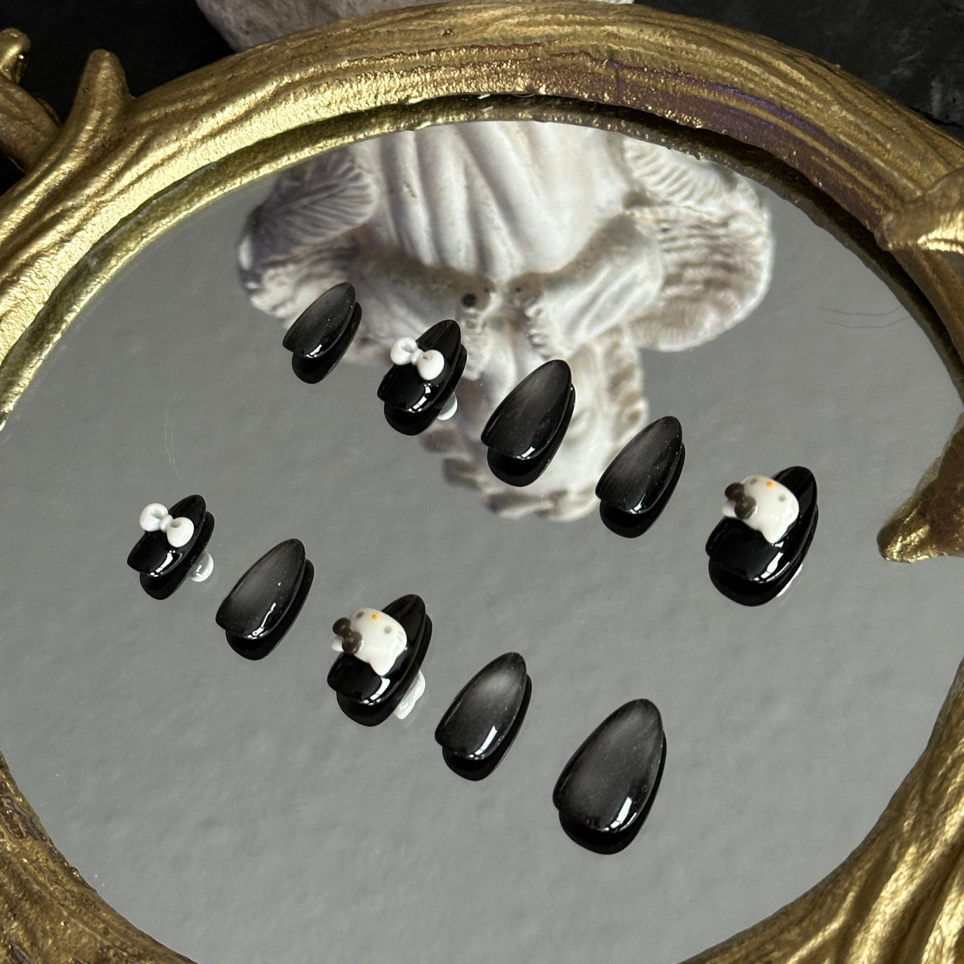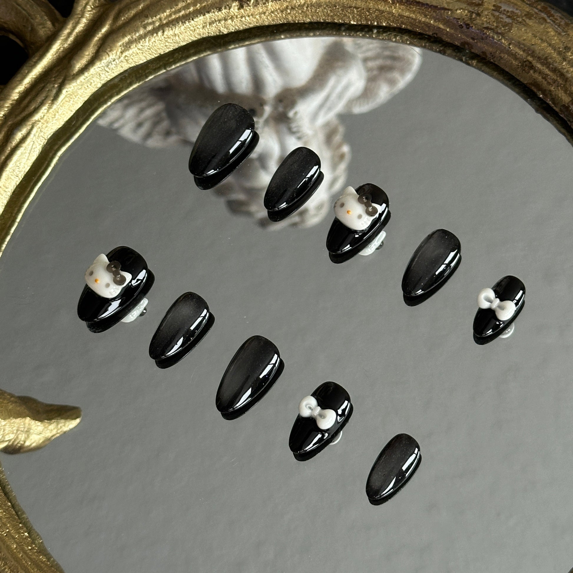 Stargazer is a cosmic journey handcrafted by MYOB Nails, blending the mysterious allure of a midnight sky with playful feline energy. This set features a mesmerizing black and silver cat-eye base, where light dances across the surface like a shifting nebula. Adorned with 3D kitten charms and delicate white bows, it creates a striking contrast between "edgy techwear" and "kawaii chic." It is a tribute to the stargazers—the dreamers who find magic in the dark and beauty in the unknown.