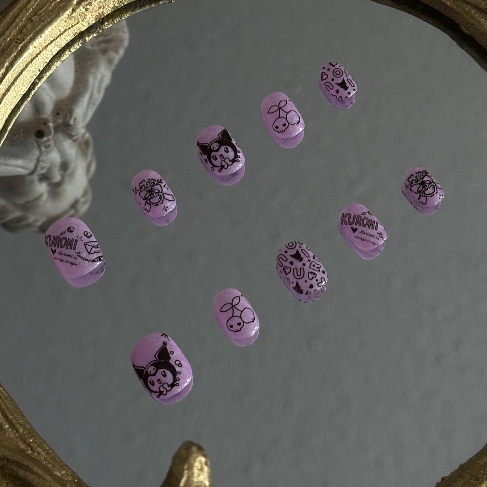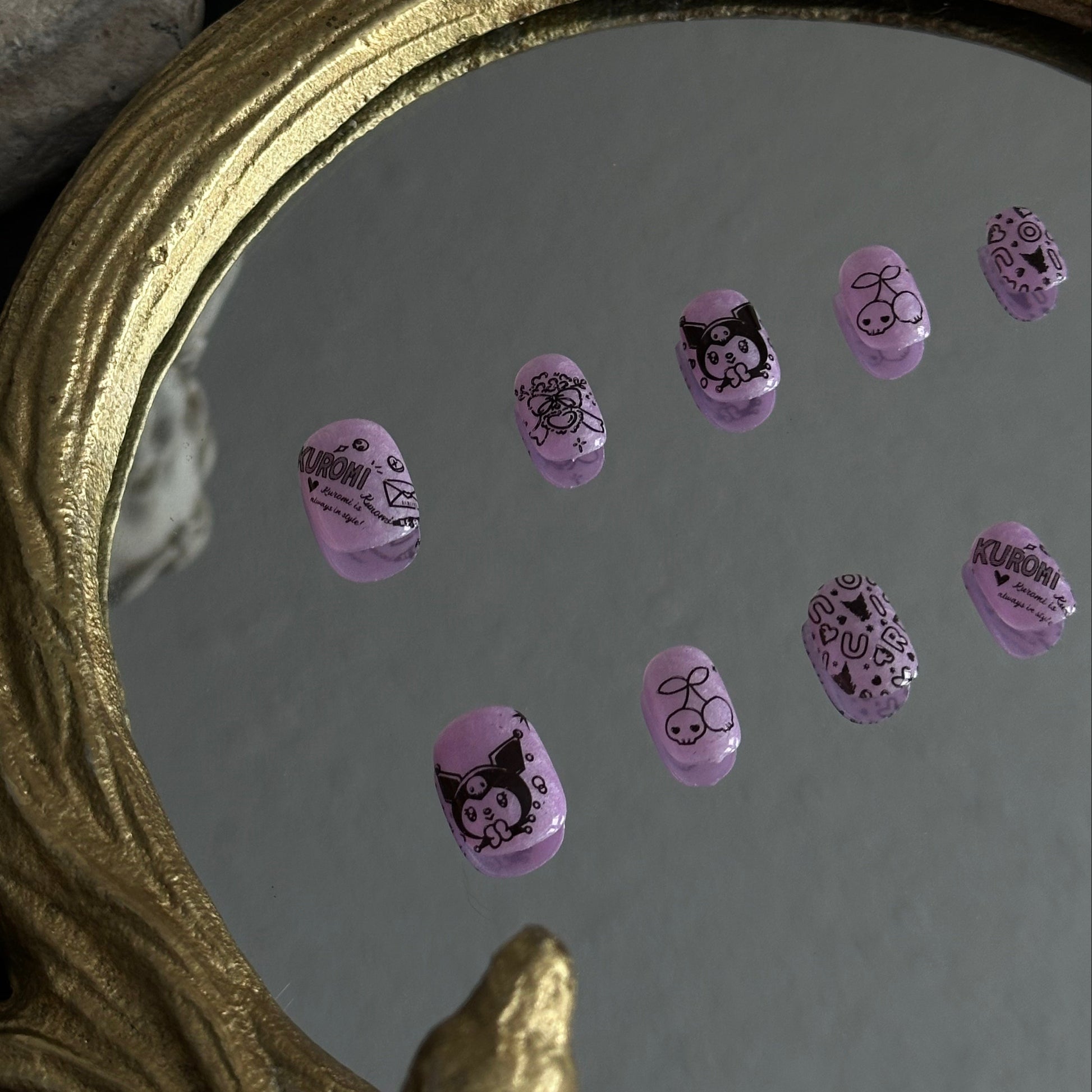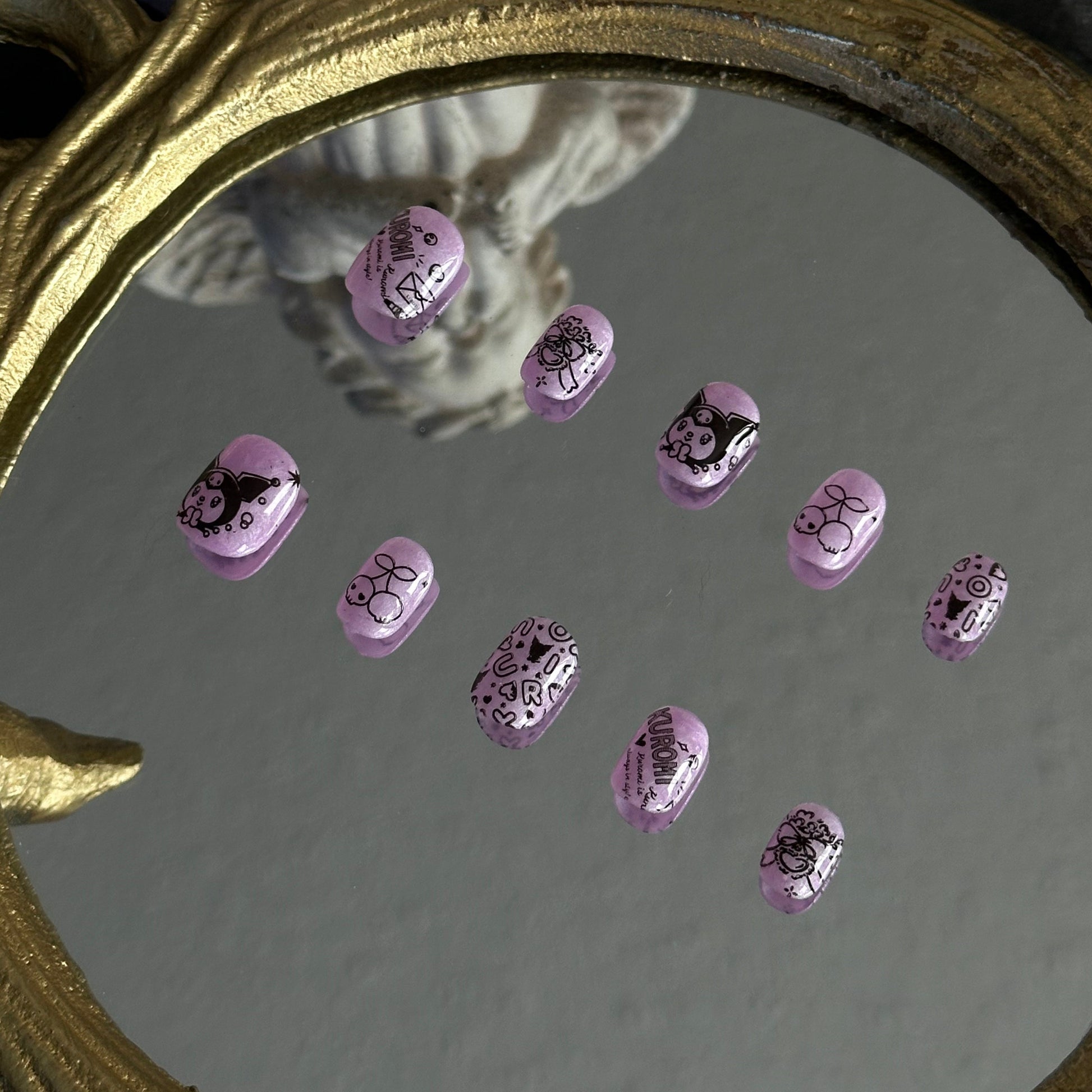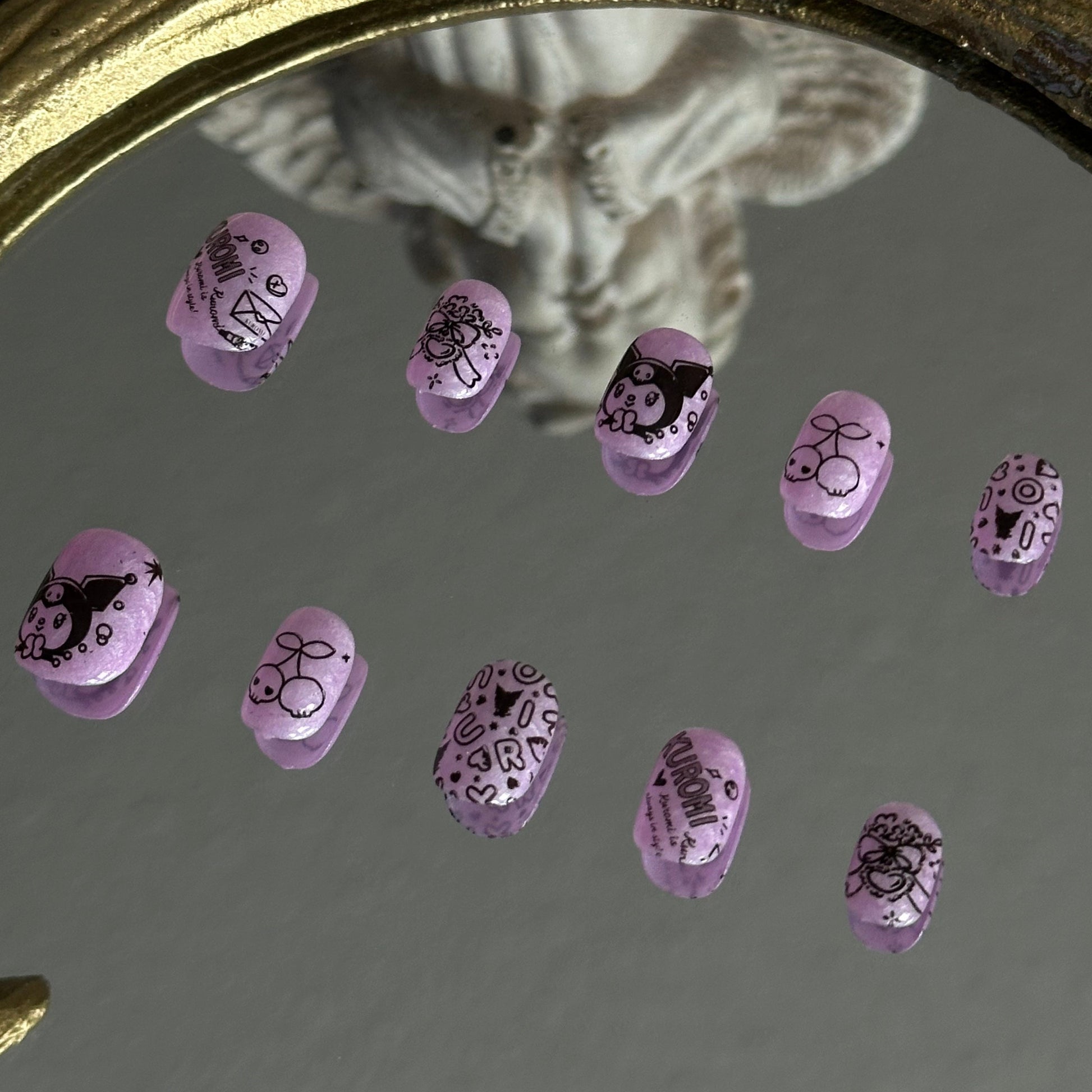 Sweet Chaos is a handcrafted tribute to the iconic "Cute but Psycho" aesthetic by MYOB Nails. This set features a translucent lilac jelly base that provides a soft, ethereal backdrop for a riot of hand-painted black line art. From the mischievous Kuromi herself to edgy skull doodles, thorny hearts, and gothic cherries, every nail captures a spirit of beautiful chaos. It is a playful embrace of the "Kawaii Goth" subculture, designed for those who celebrate their dark side with a wink.