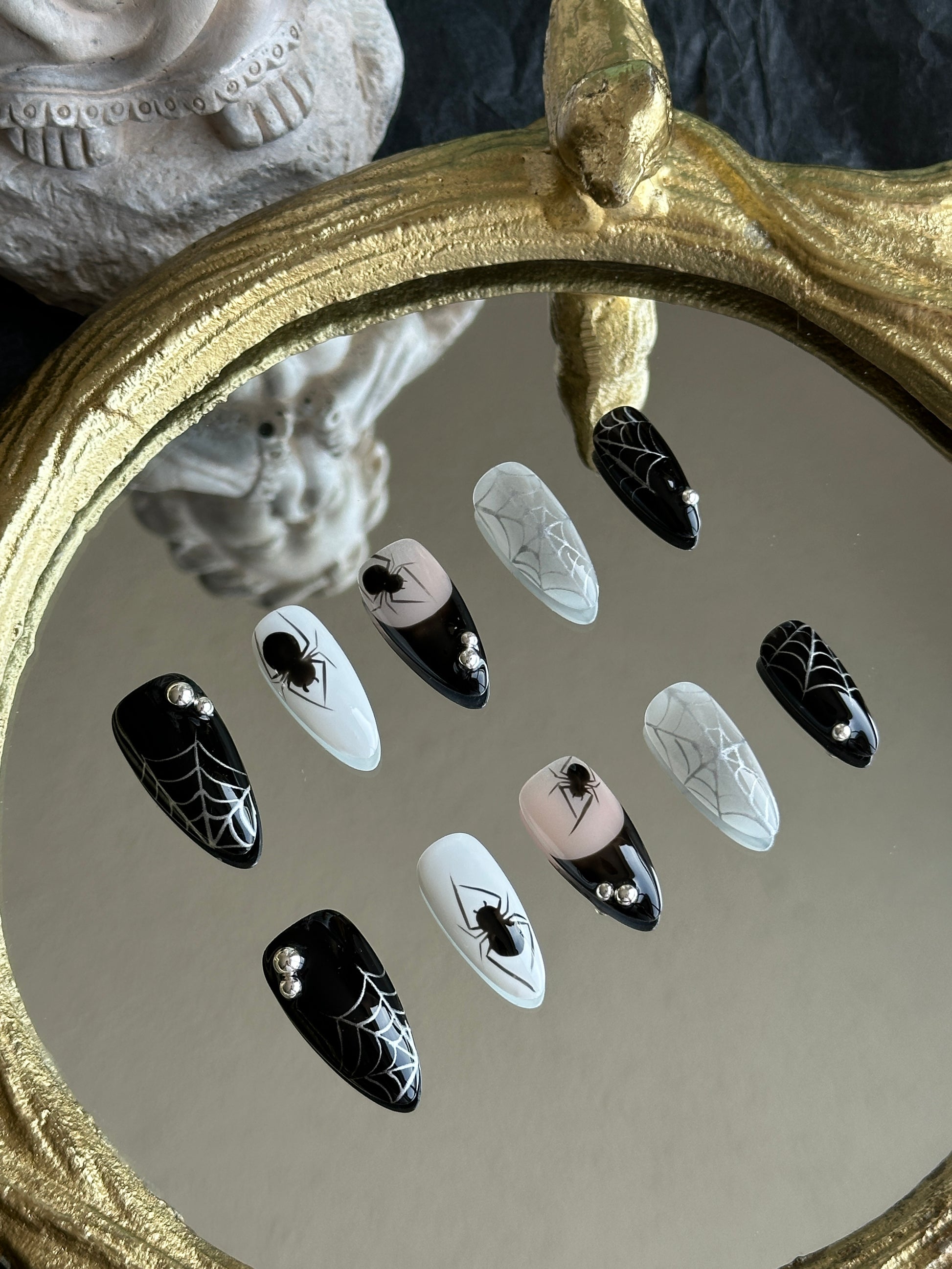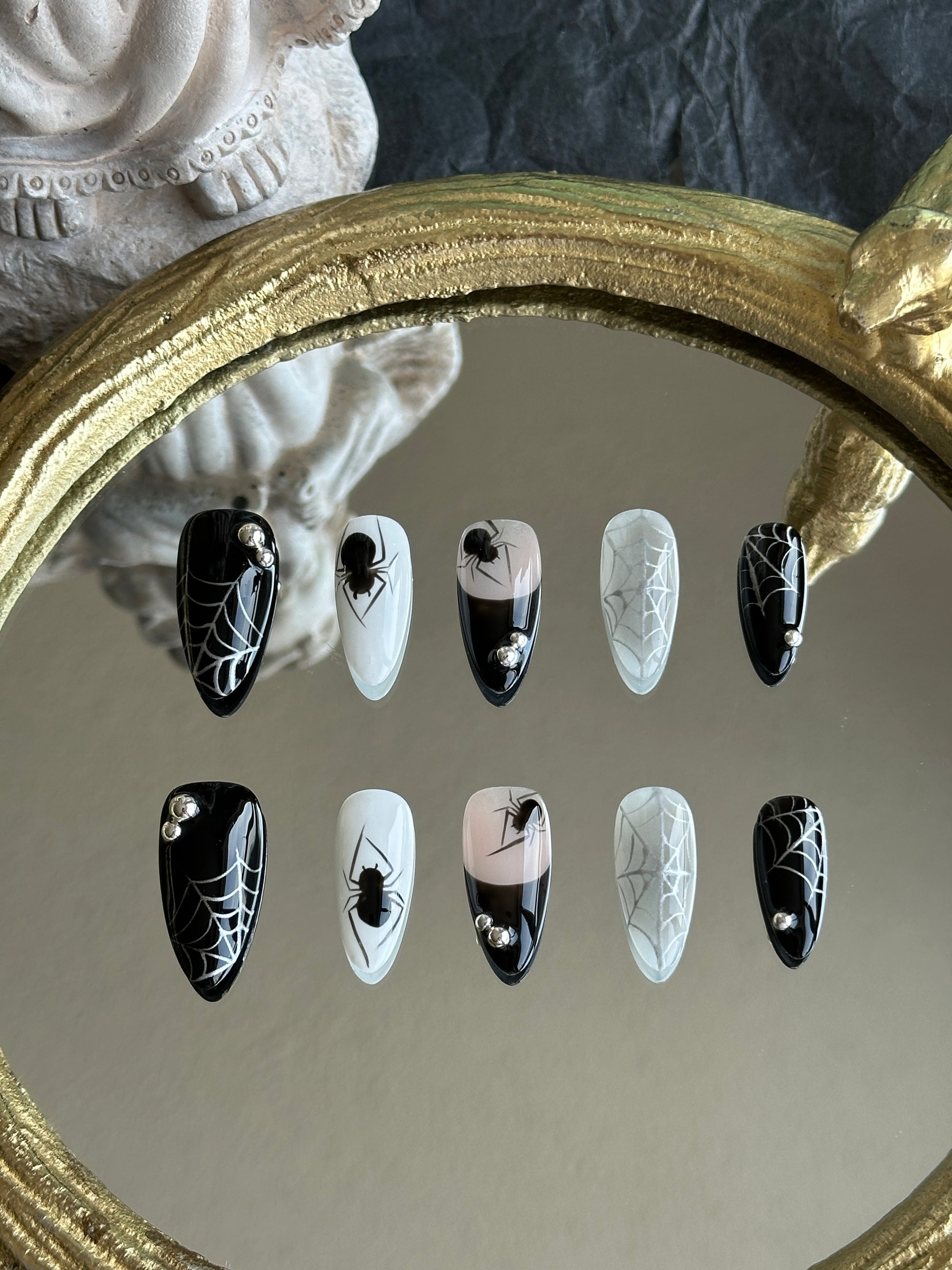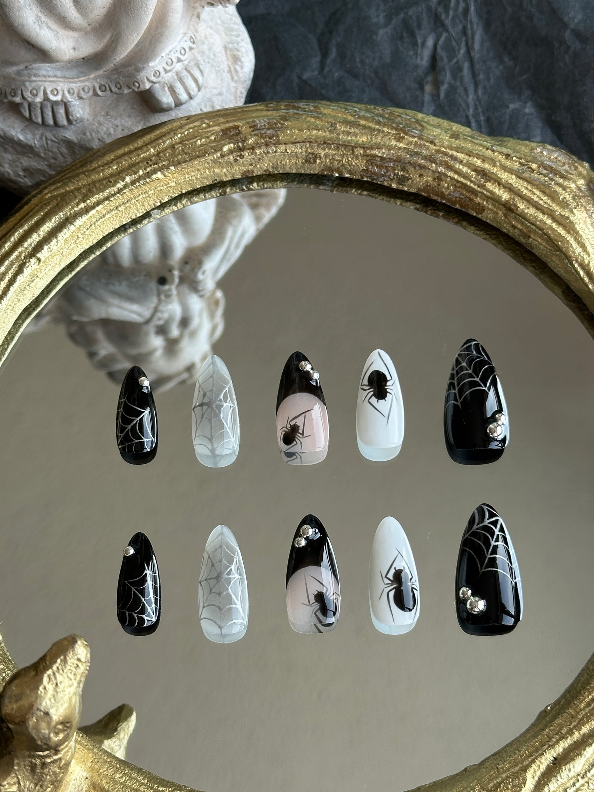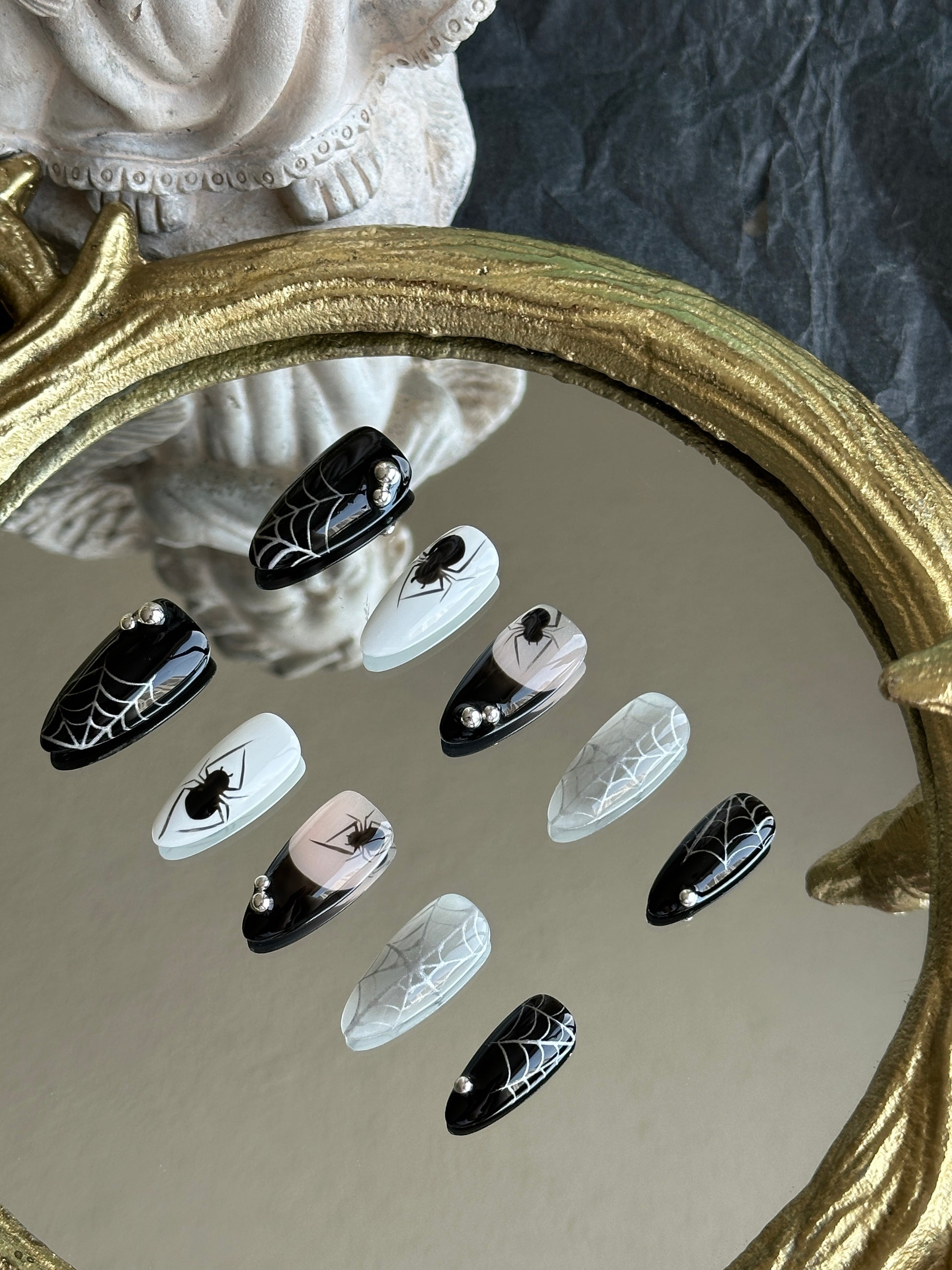 Creepy yet chic, our Web of Shadows press-on nails feature hand-painted spider webs, crawling spiders, and crystal accents. Perfect for Halloween or anyone who loves bold gothic style, this set blends eerie details with elegance.